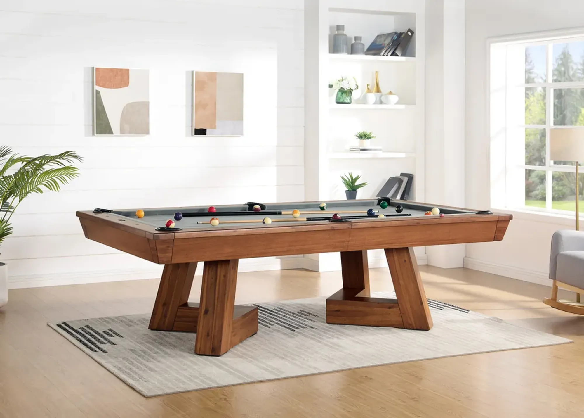Elevate your space with the stunning Aris pool table. The table is made from solid wood and finished with our rich Natural stain. The unique arrow-shaped base provides stability and a contemporary design element. Whether you’re a seasoned pro or a beginner, this pool table is sure to provide hours of fun and entertainment for you and your guests.