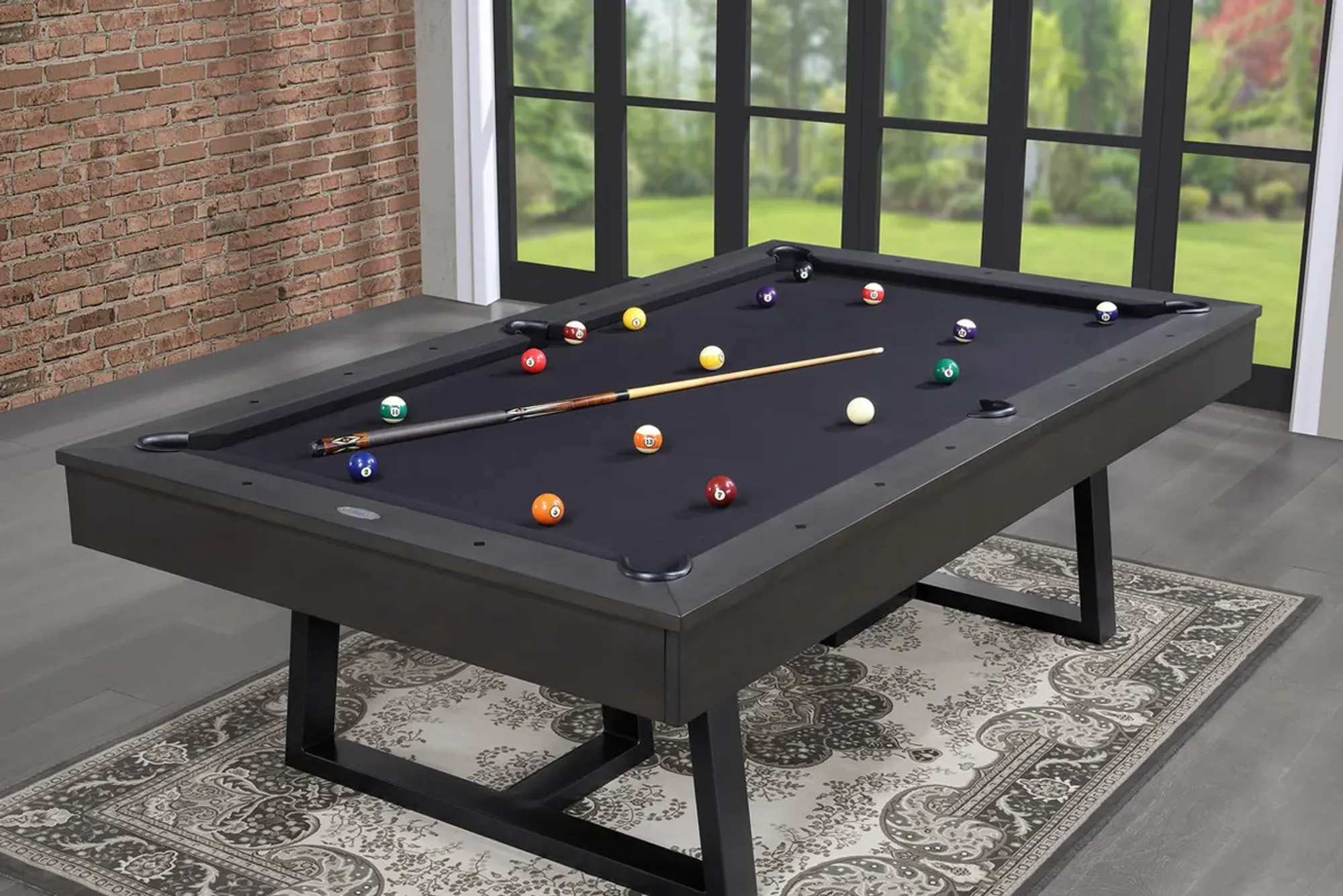 This Pool Table is masterfully crafted of kiln-dried solid Poplar, Acacia, and other hardwoods. The base is powder coated steel.