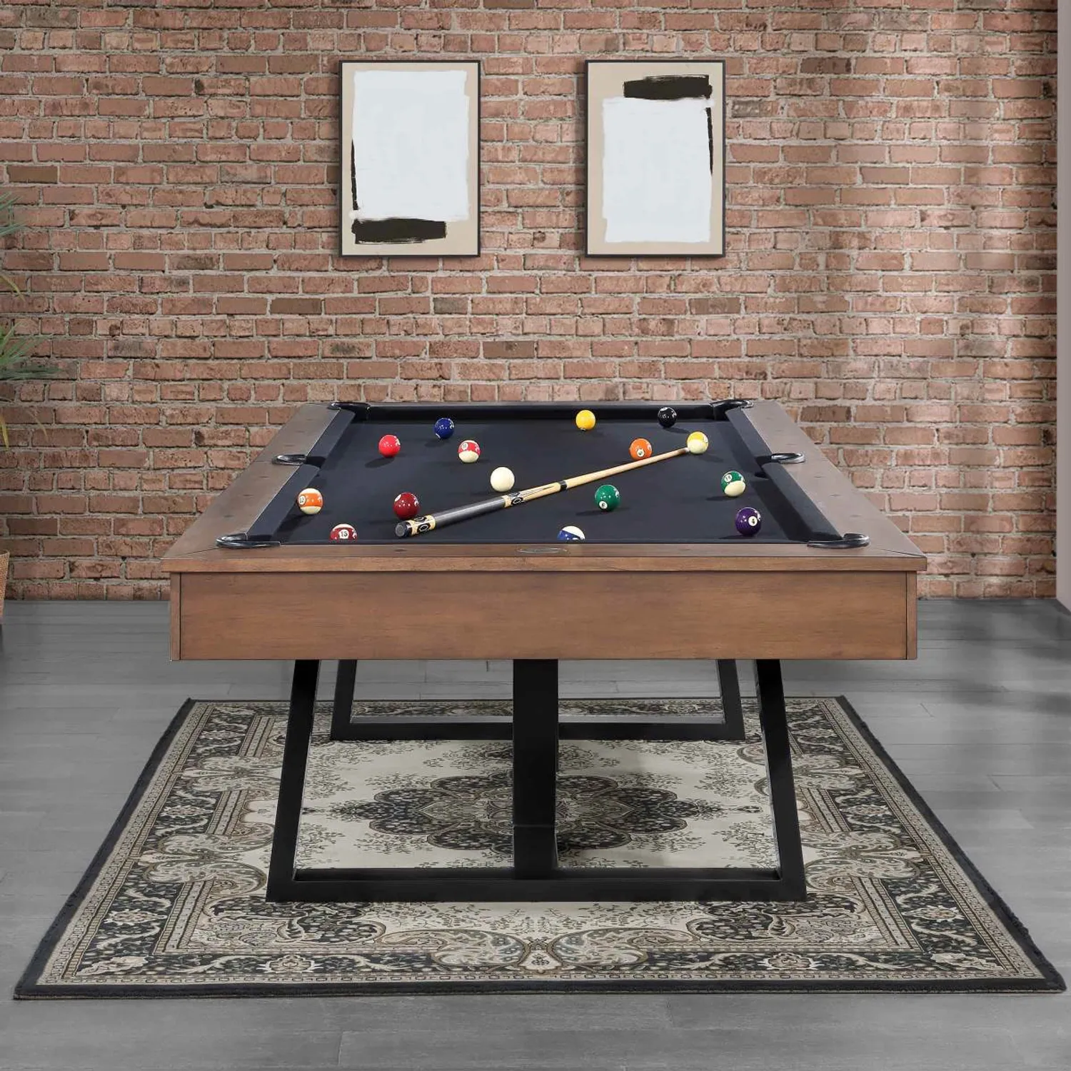 This Pool Table is masterfully crafted of kiln-dried solid Poplar, Acacia, and other hardwoods. The base is powder coated steel.