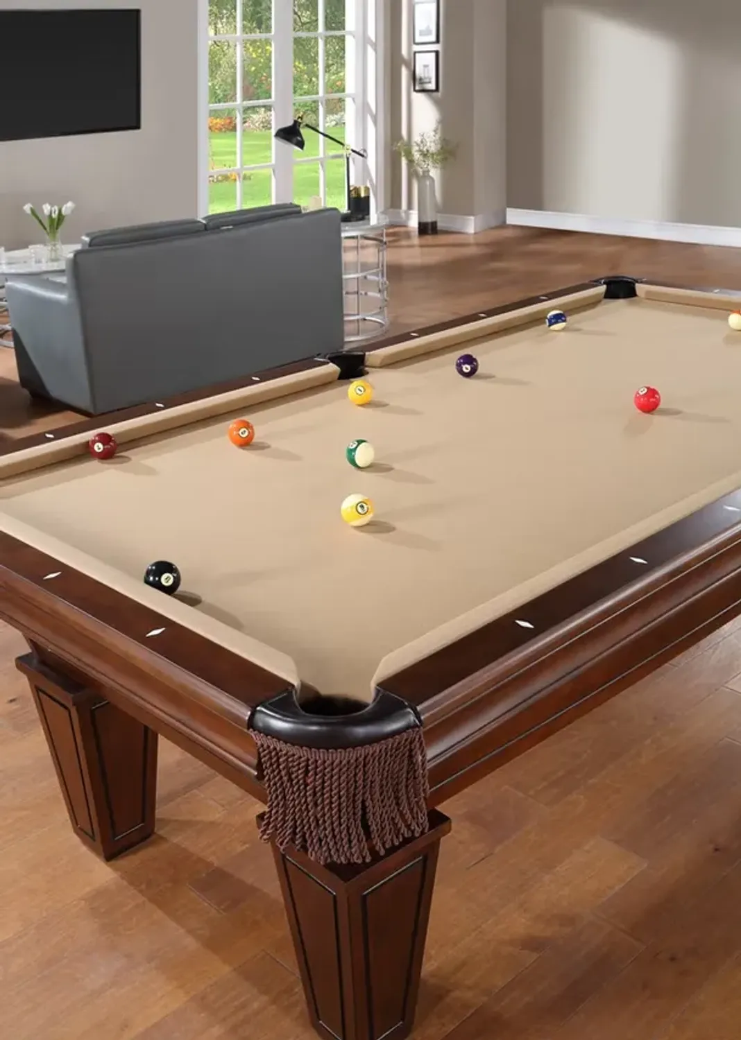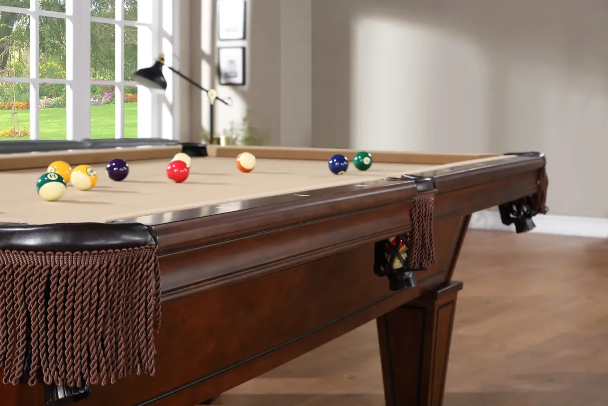 This Pool Table is masterfully crafted of kiln-dried solid Maple, solid Poplar, Birch veneers, Engineered Wood, and Polyurethane