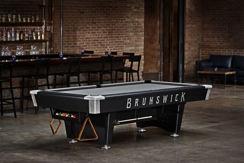 The Black Wolf Pro, a superb combination of modern styling and rigorous engineering standards, features attractive and sturdy pedestal-style legs, a leg stretcher and foot levelers. The Black Wolf Pro is available in 7′, 8′ or 9′ with pocket or gully options. (Table is shown with optional Brunswick decal.)