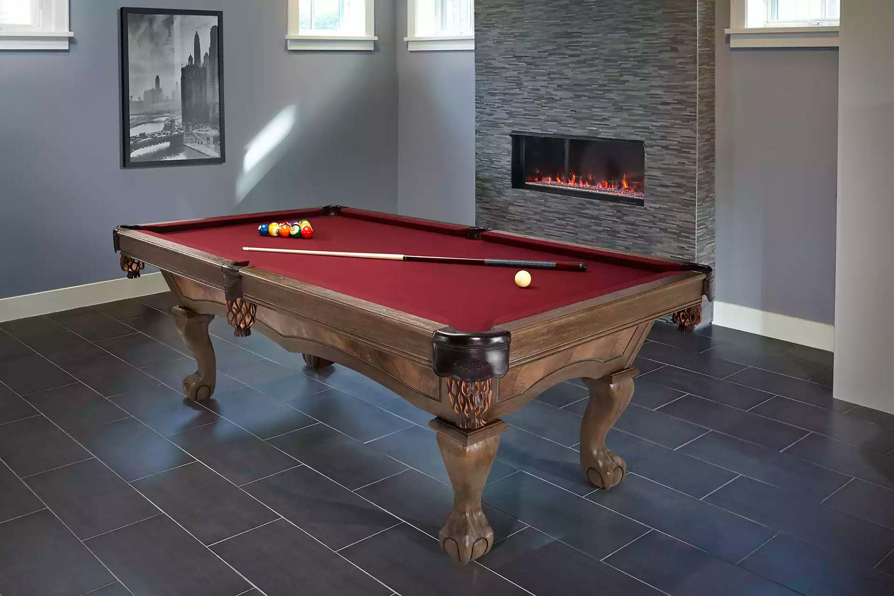 This traditionally- styled and beautifully made Brunswick Brae Loch 8-Foot Billiard Table makes a classic centerpiece for any game or family room. Traditionally styled in a nutmeg finish, the Brae Loch billiard table features a double-arched base with ball-and-claw legs. Durable, classic design crafted to last, the Brae Loch frame is constructed of superior engineered and select veneered hardwood. Classic in style, this table has Brunswick slate accents and camphor burl inlays with a double arch. Shield style pockets for a traditional look.