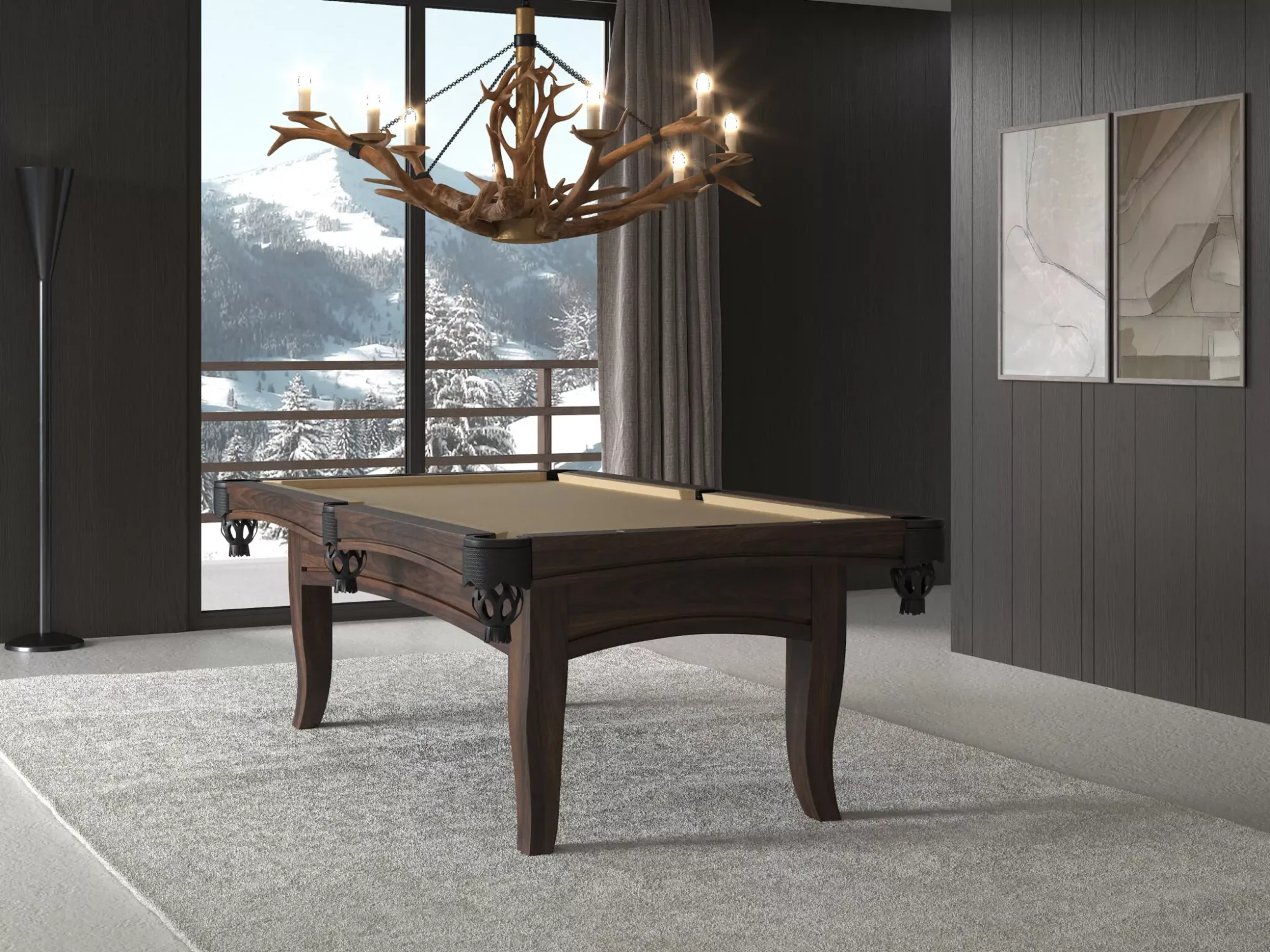 The Carter pool table has solid wood legs that extend up to the slate, an arched cabinet, extra-thick rails and easy, sloping curves. This transitional table will look elegant in homes with contemporary or traditional designs.