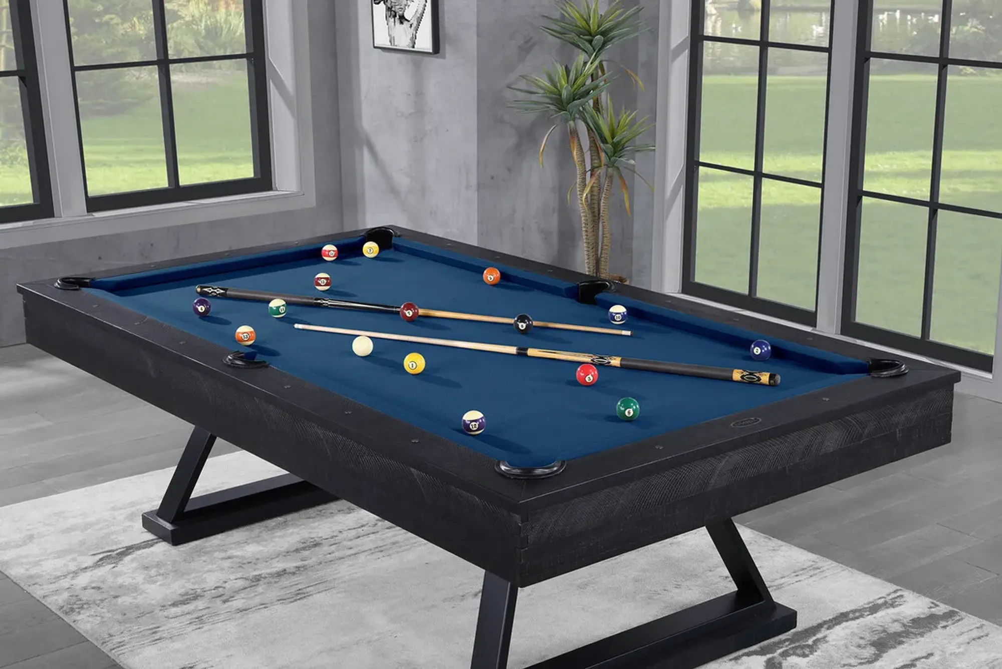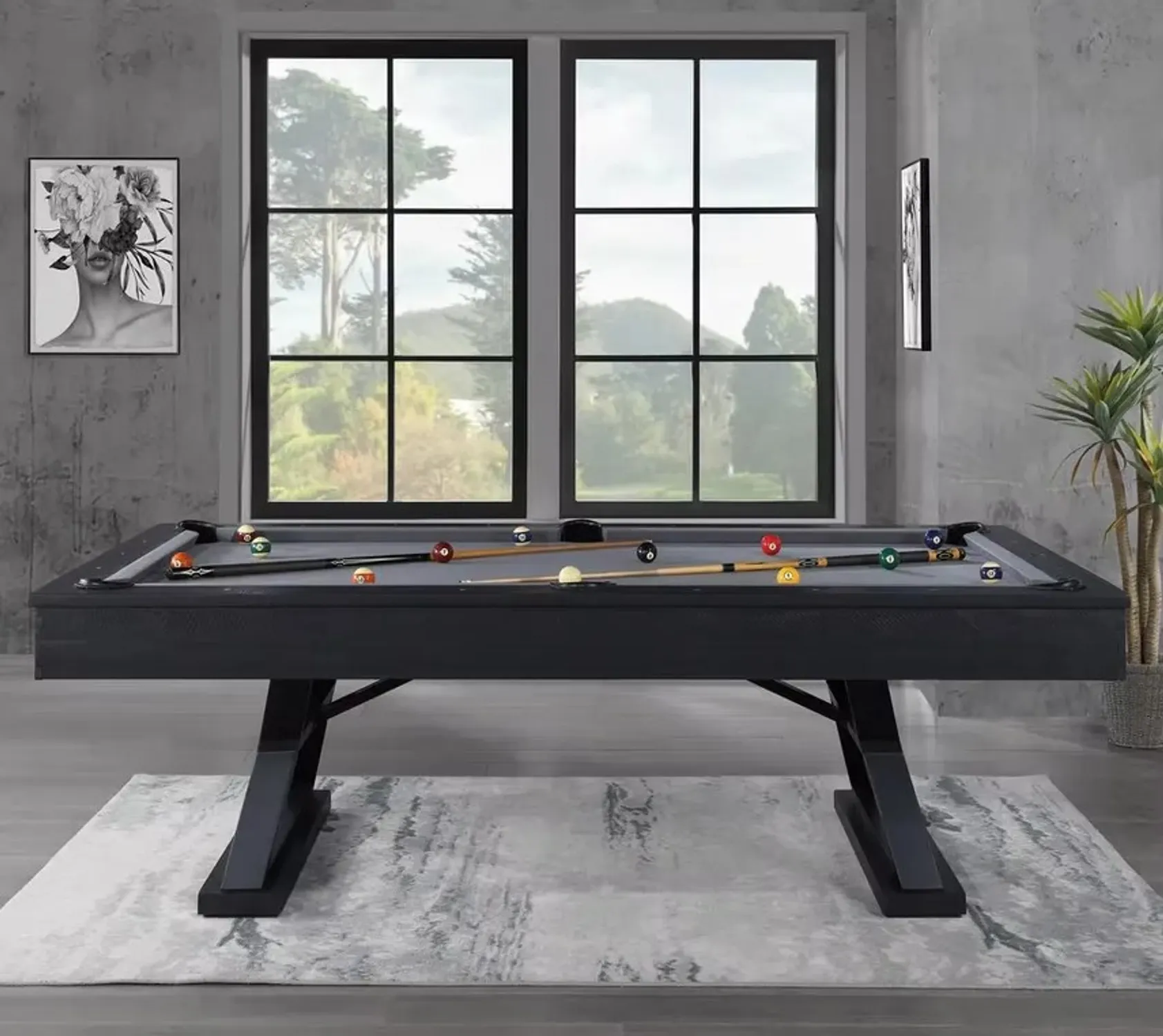 Introducing the epitome of contemporary leisure, the Durham modern industrial pool table seamlessly blends sophistication and functionality. Supported by sleek and sturdy metal legs, this table boasts an urban edge while ensuring stability during intense gameplay. Its alluring Ink Black finish not only adds a touch of rustic elegance but also enhances the overall aesthetic, making it a striking centerpiece for any contemporary gaming space.