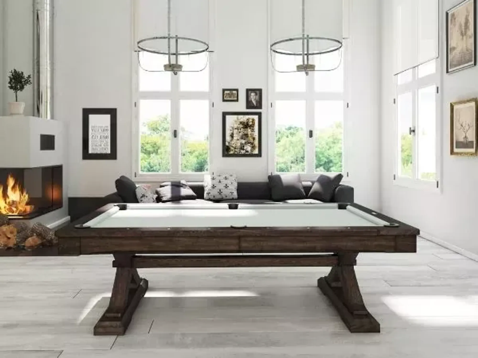 The weathered Kariba pool table is a solid wood pool table with a dining tabletop option. This stylish transitional design is finished with an in-vogue charcoal brown finish. The dining top helps convert the table form playtime to dinner time within minutes. It’s perfect for those who might be limited in space.
