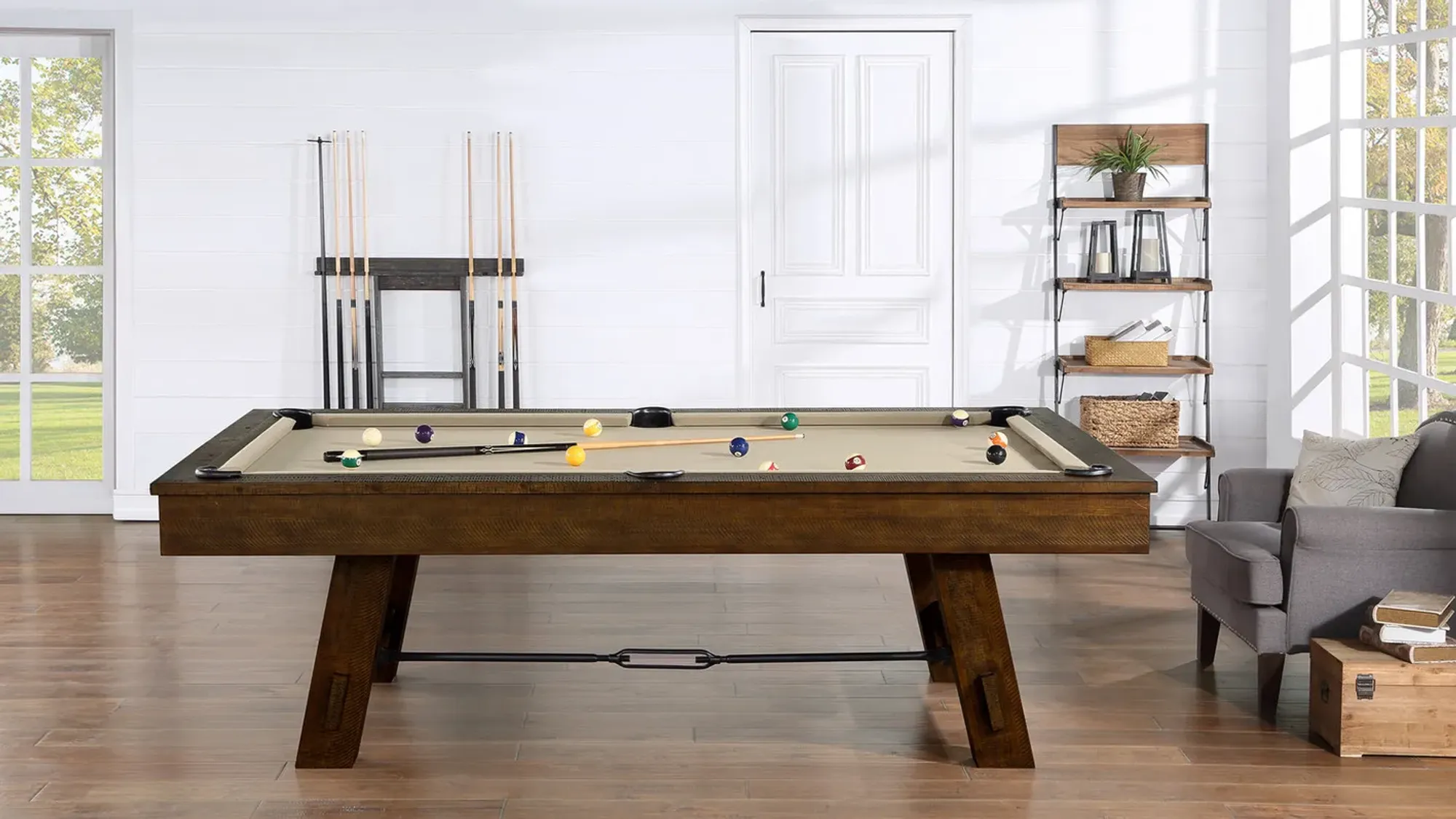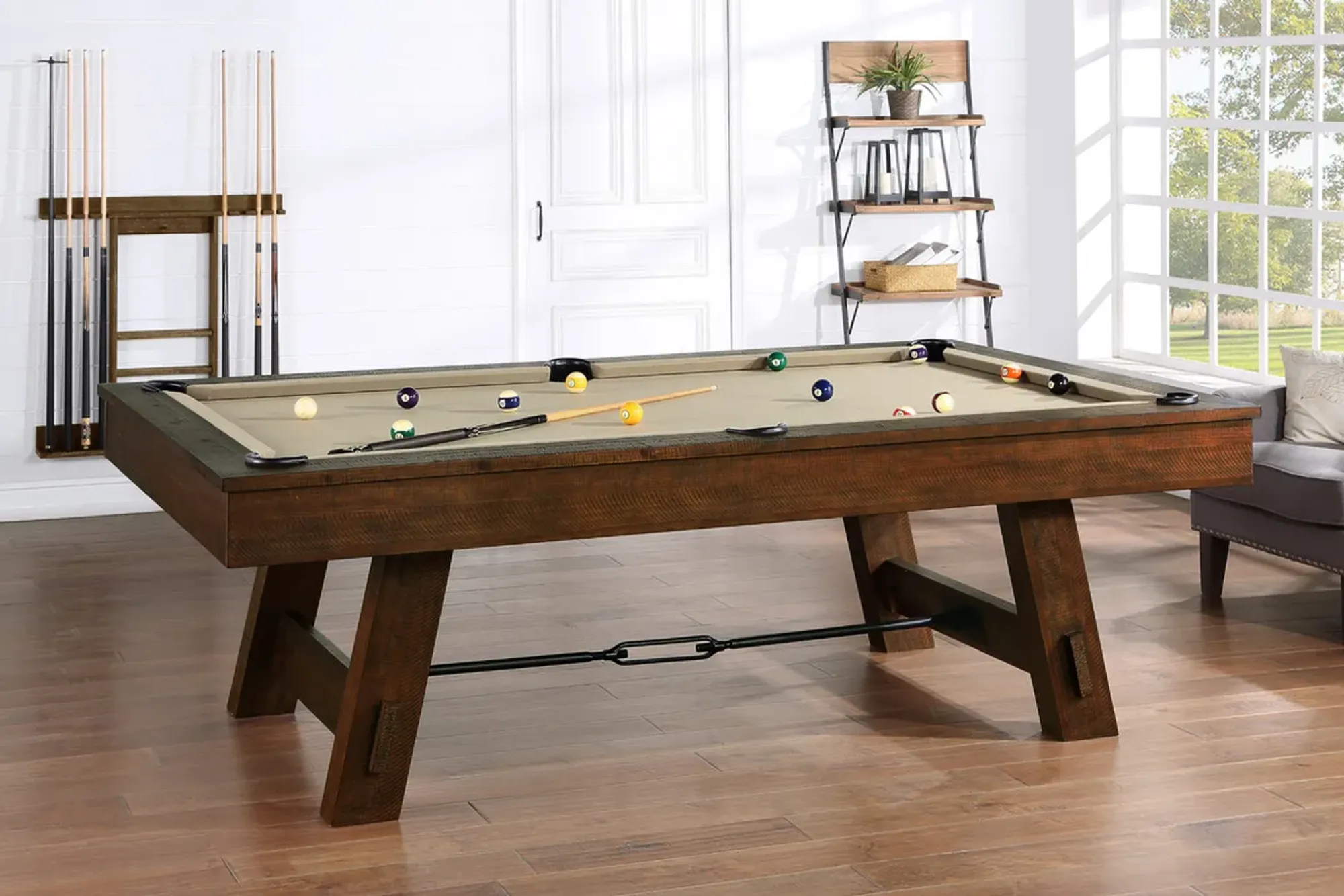 This Pool Table is masterfully crafted of kiln-dried solid Pine, Pine veneers, Acacia, Powder Coated Steel, and Engineered Wood.