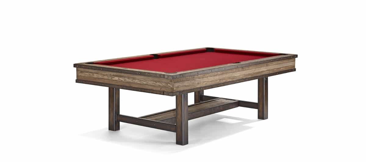 The Edinburgh Pool Table by Brunswick Billiards is a mixed media wood and metal design with vintage flair and rustic appeal. The solid hardwood components are White oak and Ash in alternating patterns with hammered and aged metal trim to create a unique and visually impactful heirloom pool table for home or business. The Edinburgh features Brunswick certified 1″ framed tournament slate play surface, Superspeed cushion rubbers, two different leg base styles, legendary Brunswick playability, and a limited lifetime warranty on all wood components and slate. Both wood and steel leg options are available.