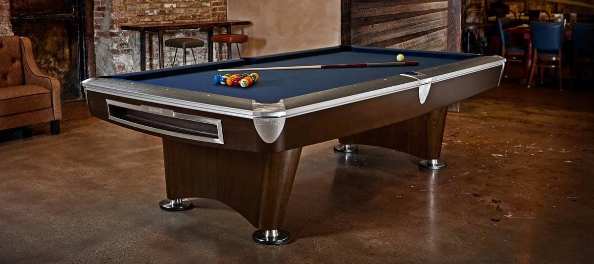 The Gold Crown VI continues Brunswick’s tradition of excellence as the newest edition of the legendary table series. The Gold Crown VI features a familiar design with modern styling. The new low-profile leg base and hidden stretcher provide a streamlined appearance while the angular canted leg emphasizes the clean lines. The table also features new corner and rail castings in a brushed nickel finish for a sleek high-end aesthetic. Available in 8′ and 9′ options. (Please note, the 8′ table does not come with a ball storage box.).