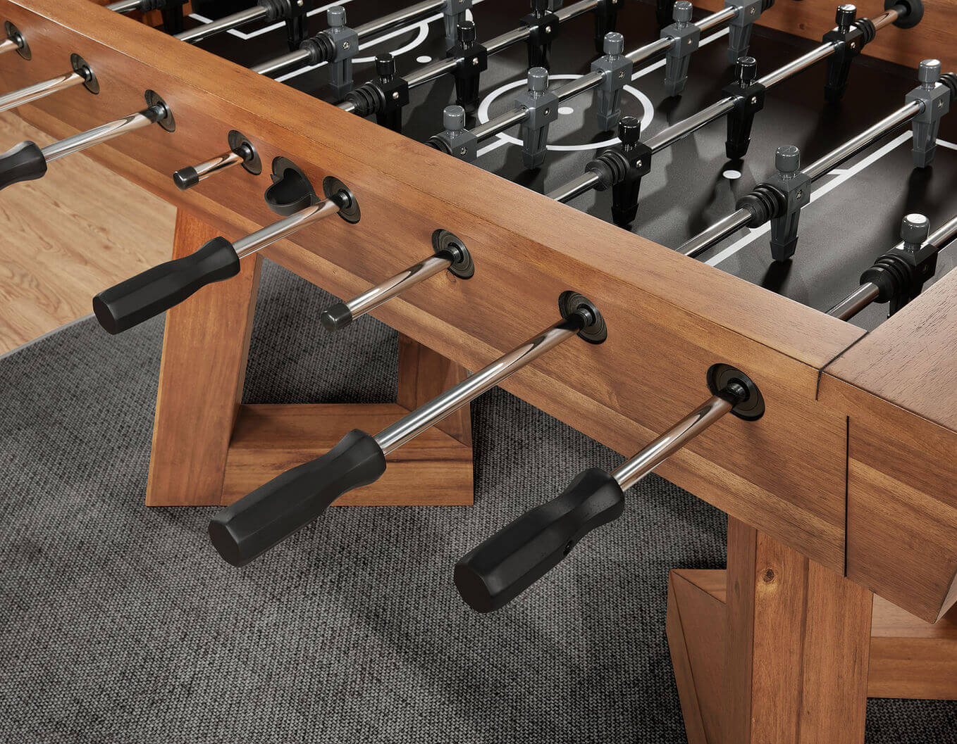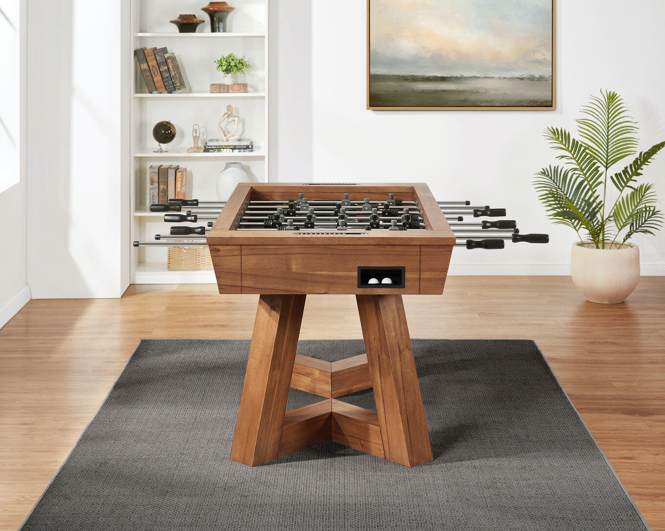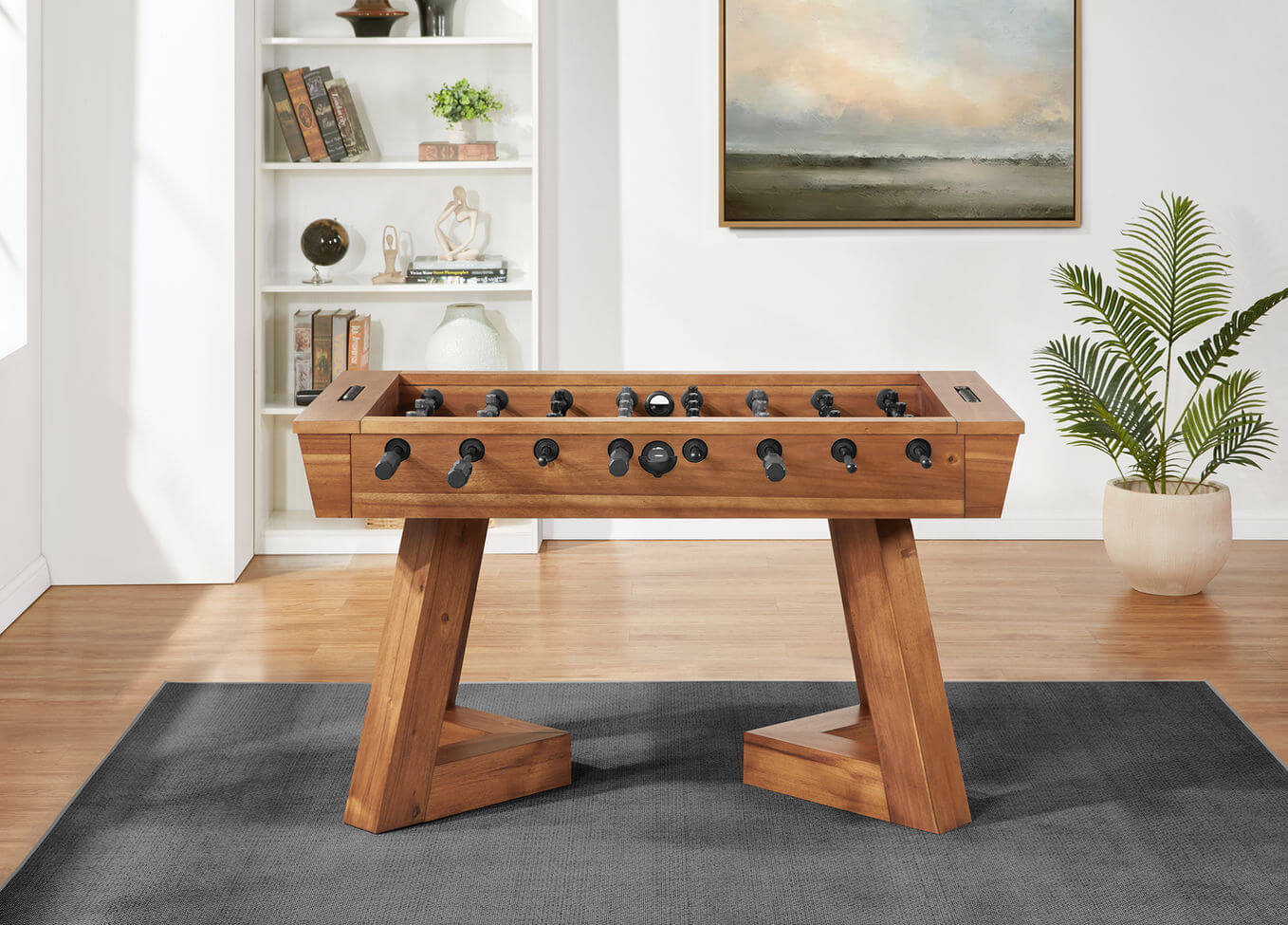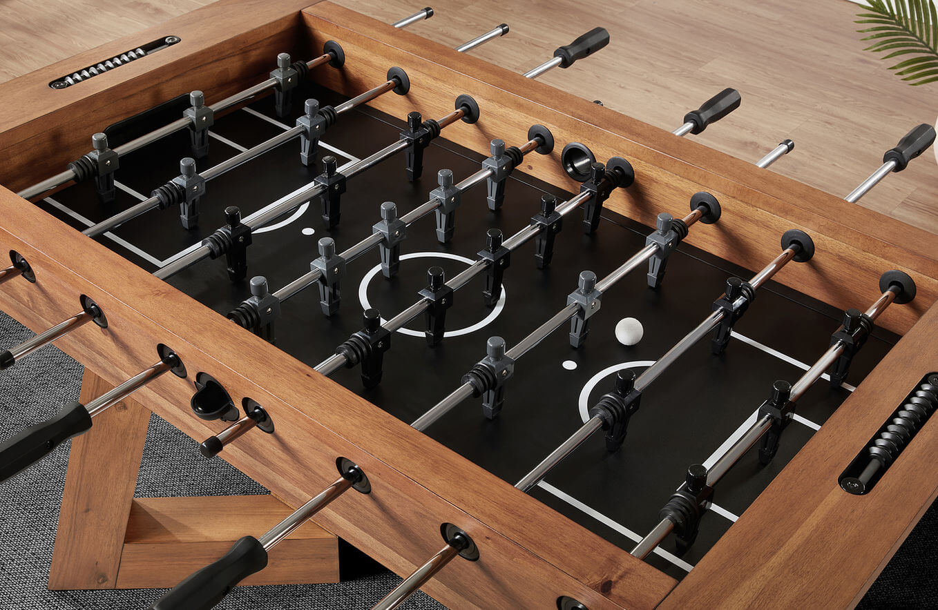 Bring energy and elegance to your game space with the Aris Foosball Table — a thoughtfully designed piece that blends timeless fun with modern craftsmanship. Its bold, angular legs not only provide a stable foundation for intense matches but also serve as a distinctive design feature. Constructed from sturdy engineered wood and finished in a warm, natural tone, the Aris makes a stylish statement in any room.