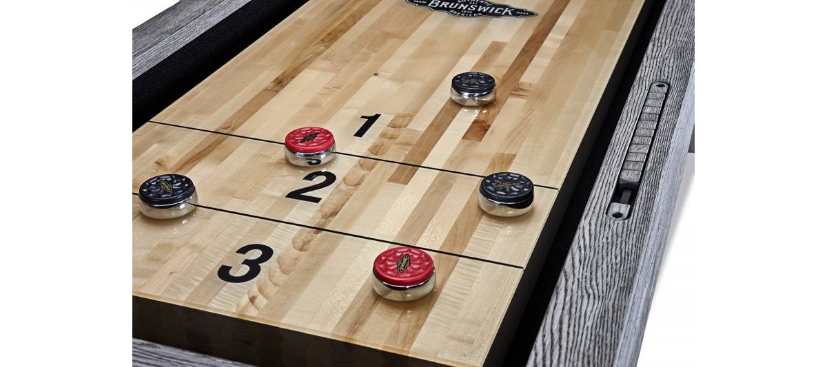 Included accessories: four black pucks, four red pucks, built in abacus scoring system, table brush, and Shuffleboard Wax
